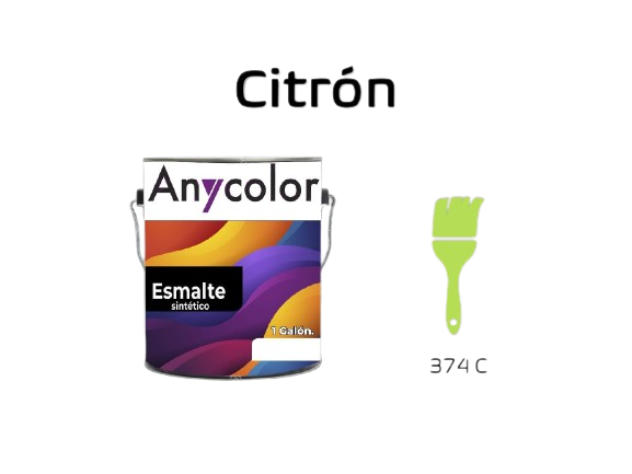 PINTURA ARQUITECTONICA : TIPO:ESMALTE ACABADO: BRILLANTE PARA INTERIOR/EXTERIOR COLOR: PANTONE 374 C DE 1GL RENDIMIENTO: 41-45 m2 LAVABILIDAD: ALTA UNIDAD G.F.: 1 ANIO ANYCOLOR 151901-374C