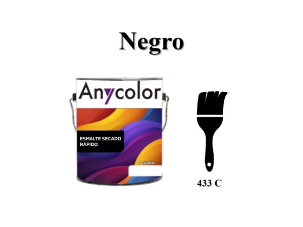 PINTURA ARQUITECTONICA : TIPO:ESMALTE ACABADO: BRILLANTE PARA INTERIOR/EXTERIOR COLOR: PANTONE 433 C DE 1GL RENDIMIENTO: 56-60 m2 LAVABILIDAD: ALTA UNIDAD G.F.: 1 ANIO ANYCOLOR 152801-GLOSS-NEGRO