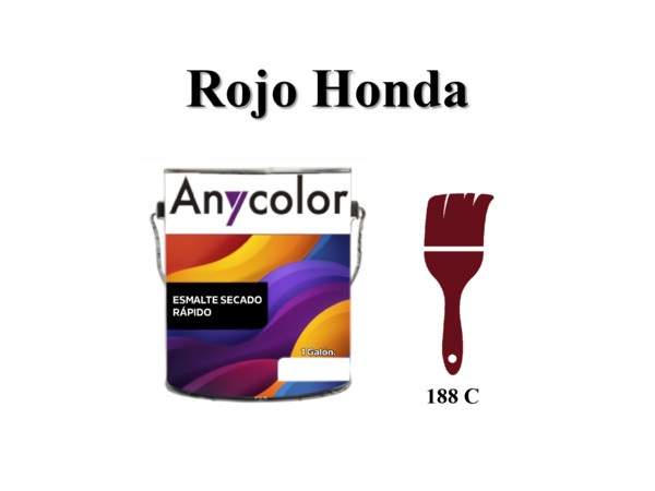PINTURA ARQUITECTONICA : TIPO:ESMALTE ACABADO: BRILLANTE PARA INTERIOR/EXTERIOR COLOR: PANTONE 188 C DE 1GL RENDIMIENTO: 56-60 m2 LAVABILIDAD: ALTA UNIDAD G.F.: 1 ANIO ANYCOLOR 152801-GLOSS-ROJO-HONDA