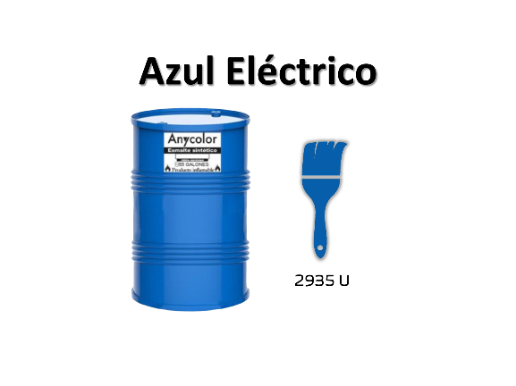 PINTURA ARQUITECTONICA : TIPO:ESMALTE ACABADO: BRILLANTE PARA INTERIOR/EXTERIOR COLOR: PANTONE 2935 U DE 55GL RENDIMIENTO: 2255-2475 m2 LAVABILIDAD: ALTA UNIDAD G.F.: 1 ANIO ANYCOLOR PC-0100015205046