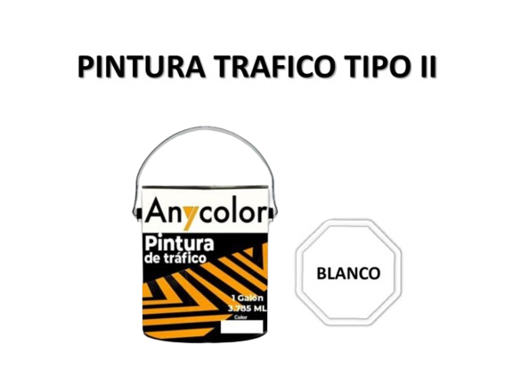 PINTURA VIAL : TIPO: ALQUIDICO COLOR: BLANCO DE RENDIMIENTO ENTRE:111-115 ML PRESENTACION: 1 GL UNIDAD DILUYENTE: SOLVENTE G.F.: 1 ANIO ANYCOLOR 0300018010024-TTPII
