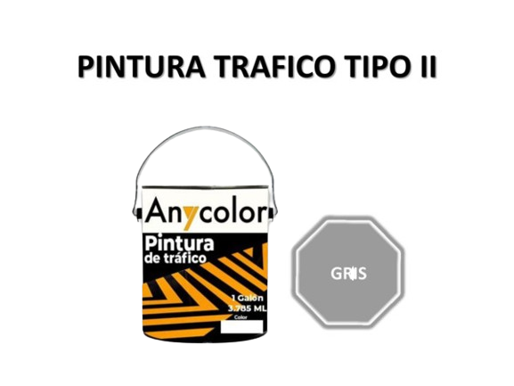 PINTURA VIAL : TIPO: ALQUIDICO GRIS DE RENDIMIENTO ENTRE:111-115 ML PRESENTACION: 1 GL UNIDAD DILUYENTE: SOLVENTE G.F.: 1 ANIO ANYCOLOR 0300018050024-TTPII