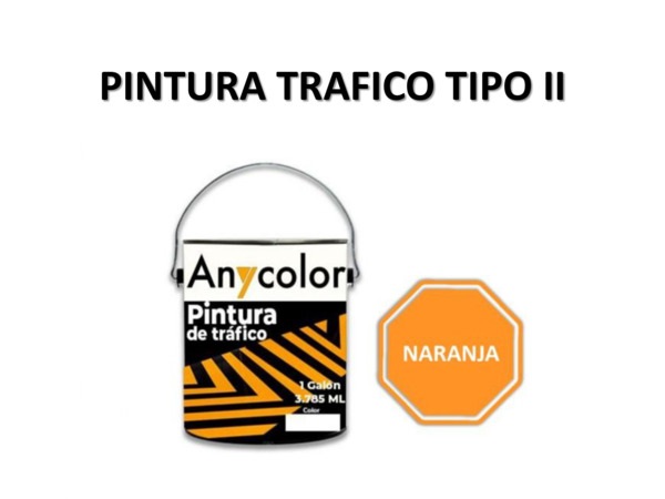 PINTURA VIAL : TIPO: ALQUIDICO NARANJA DE RENDIMIENTO ENTRE:111-115 ML PRESENTACION: 1 GL UNIDAD DILUYENTE: SOLVENTE G.F.: 1 ANIO ANYCOLOR 0300018080024-TTP