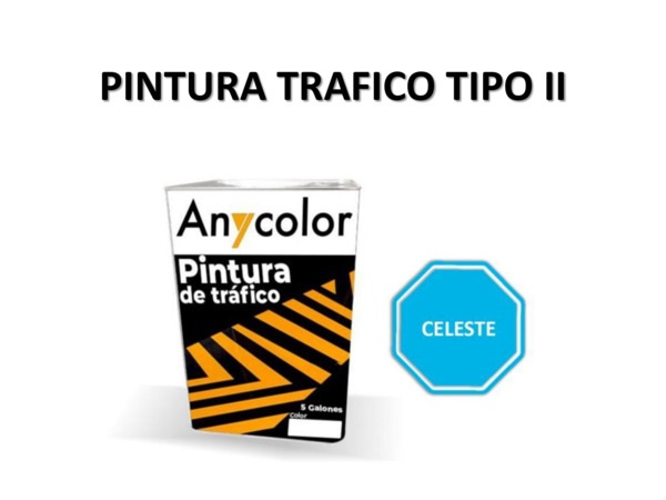 PINTURA VIAL : TIPO: ALQUIDICO COLOR: CELESTE DE RENDIMIENTO ENTRE:555-575 ML PRESENTACION: 5 GLS UNIDAD DILUYENTE: SOLVENTE G.F.: 1 ANIO ANYCOLOR 0300018170027-TTP