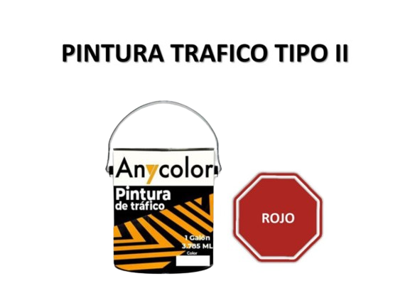 PINTURA VIAL : TIPO: ALQUIDICO COLOR: ROJO DE RENDIMIENTO ENTRE:111-115 ML PRESENTACION: 1 GL UNIDAD DILUYENTE: SOLVENTE G.F.: 1 ANIO ANYCOLOR 0300018180024-TTPII