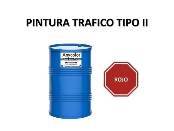 PINTURA VIAL : TIPO: ALQUIDICO COLOR: ROJO DE RENDIMIENTO ENTRE:6105-6325 ML PRESENTACION: 55 GLS UNIDAD DILUYENTE: SOLVENTE G.F.: 1 ANIO ANYCOLOR 0300018180046-TTPII