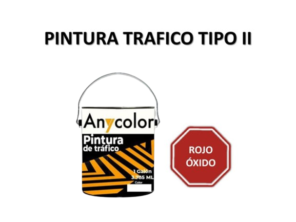 PINTURA VIAL : TIPO: ALQUIDICO ROJO OXIDO DE RENDIMIENTO ENTRE:111-115 ML PRESENTACION: 1 GL UNIDAD DILUYENTE: SOLVENTE G.F.: 1 ANIO ANYCOLOR 0300018187024-TTPII