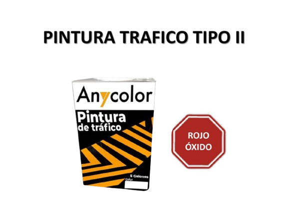 PINTURA VIAL : TIPO: ALQUIDICO ROJO OXIDO DE RENDIMIENTO ENTRE:555-575 ML PRESENTACION: 5 GLS UNIDAD DILUYENTE: SOLVENTE G.F.: 1 ANIO ANYCOLOR 0300018187027-TTPII