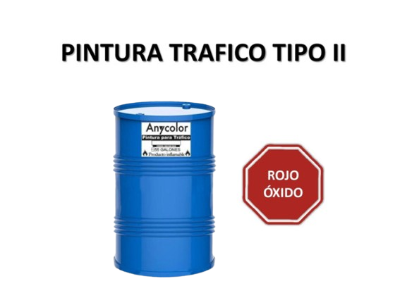PINTURA VIAL : TIPO: ALQUIDICO ROJO OXIDO DE RENDIMIENTO ENTRE:6105-6325 ML PRESENTACION: 55 GLS UNIDAD DILUYENTE: SOLVENTE G.F.: 1 ANIO ANYCOLOR 0300018187046-TTPII