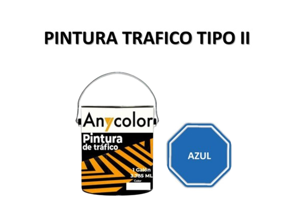 PINTURA VIAL : TIPO: ALQUIDICO COLOR: AZUL DE RENDIMIENTO ENTRE:111-115 ML PRESENTACION: 1 GL UNIDAD DILUYENTE: SOLVENTE G.F.: 1 ANIO ANYCOLOR 0300018200024-TTPII