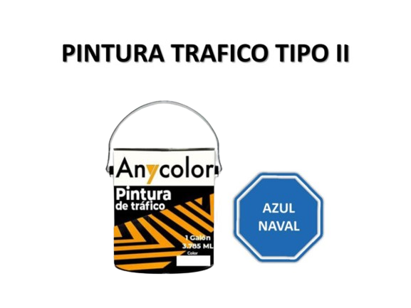 PINTURA VIAL : TIPO: ALQUIDICO AZUL NAVAL DE RENDIMIENTO ENTRE:111-115 ML PRESENTACION: 1 GL UNIDAD DILUYENTE: SOLVENTE G.F.: 1 ANIO ANYCOLOR 0300018210024-TTPII