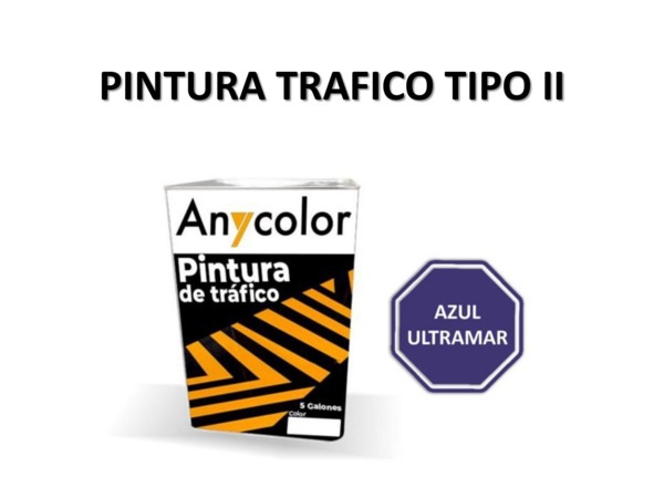 PINTURA VIAL : TIPO: ALQUIDICO AZUL ULTRAMAR DE RENDIMIENTO ENTRE:555-575 ML PRESENTACION: 5 GLS UNIDAD DILUYENTE: SOLVENTE G.F.: 1 ANIO ANYCOLOR 0300018230027-TTP