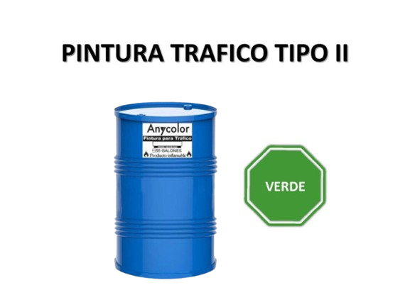PINTURA VIAL : TIPO: ALQUIDICO COLOR: VERDE DE RENDIMIENTO ENTRE:6105-6325 ML PRESENTACION: 55 GLS UNIDAD DILUYENTE: SOLVENTE G.F.: 1 ANIO ANYCOLOR 0300018250046-TTPII
