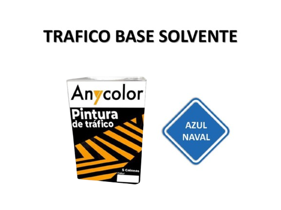 PINTURA VIAL : TIPO: ALQUIDICO AZUL NAVAL DE RENDIMIENTO ENTRE:555-575 ML PRESENTACION: 5 GLS UNIDAD DILUYENTE: SOLVENTE G.F.: 1 ANIO ANYCOLOR 0300022210027-SOLV