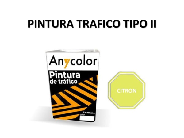 PINTURA VIAL : TIPO: ALQUIDICO CITRON DE RENDIMIENTO ENTRE:555-575 ML PRESENTACION: 5 GLS UNIDAD DILUYENTE: SOLVENTE G.F.: 1 ANIO ANYCOLOR 0300022270027-SOLV